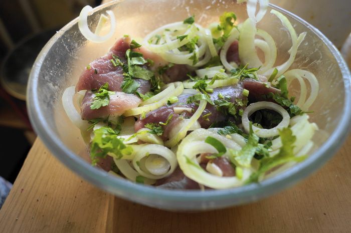 Не жирную свинину промыть, нарезать на небольшие кусочки (примерно, как для шашлыка), сложить в миску. Мясо посолить, поперчить, заправить растительным маслом и хорошо перемешать. Добавить измельченный чеснок, рубленную зелень петрушки, репчатый лук нарезанный кольцами. Выжать сок из лимона и заправить им мясо, хорошо перемешать и оставить мариноваться на 3 часа, можно дольше. Периодически мясо перемешивать.