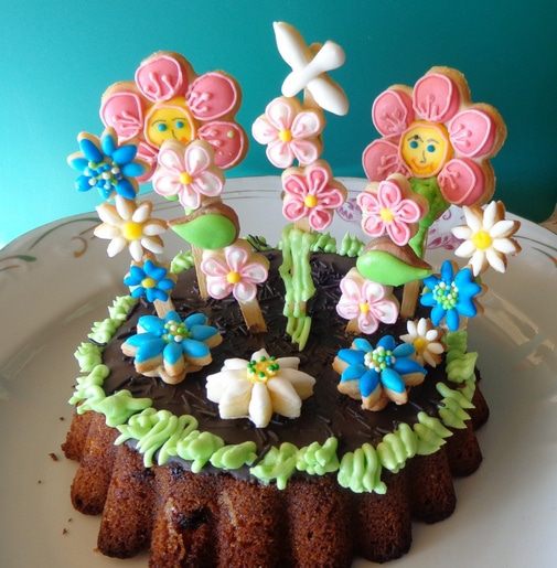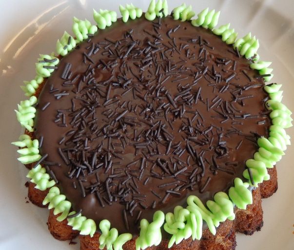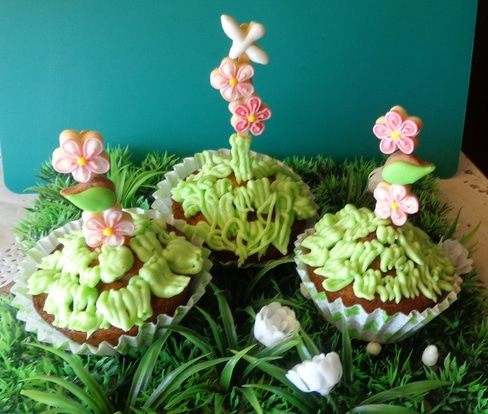 Приготовить тесто для кекса: масло комнатной температуры взбить с сахаром, по одному ввести яйца, продолжая взбивать, затем добавить муку с разрыхлителем и изюм с орехами. Перемешать. Выпекать в форме для кексов Д15 см и маффинов (у меня получилось 4 штуки) при 180 градусах минут 25-30. остудить. Срезать выпуклую верхушку. Залить верх растопленным шоколадом и украсить "травой" из масляного крема. Охладить. Так же украсить и маффины.