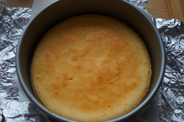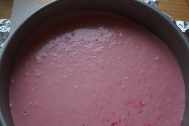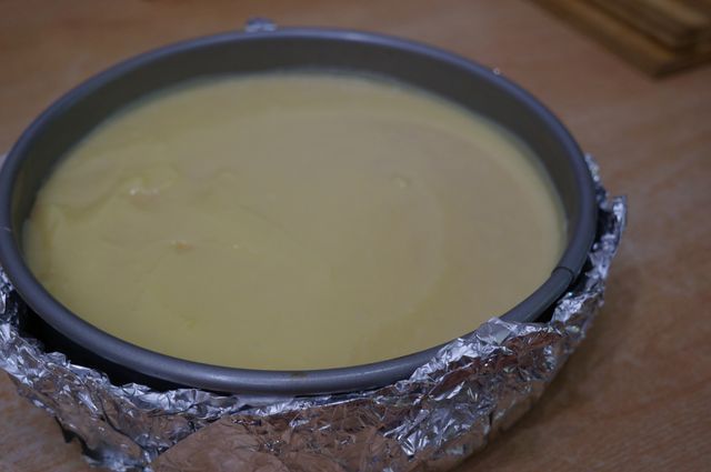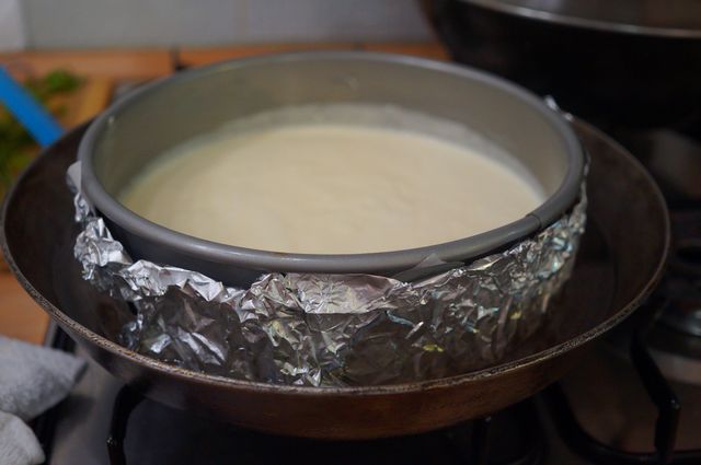 Вылить тесто, загнуть края фольги к верху формы, поставить в бОльшую форму или глубокую сковороду, налить кипяток на пару см и выпекать при 160"С до готовности.