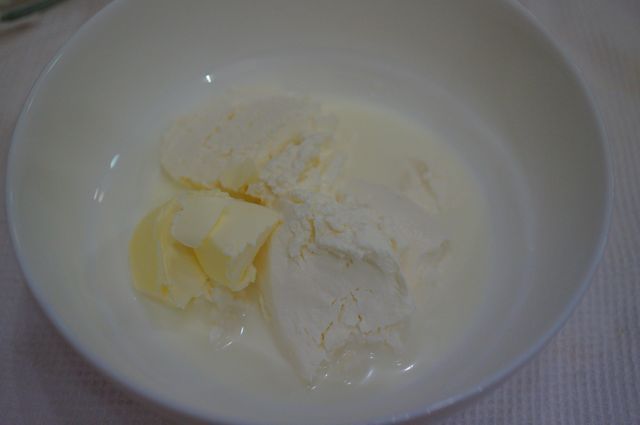Растопить вместе кремовый сыр, масло и молоко в СВЧ/ на водяной бане.
