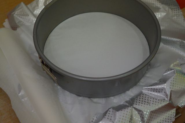 Разъемная форма 20 см, застелить крест-накрест фольгой, сверху пергамент, закрепить тортовое кольцо.