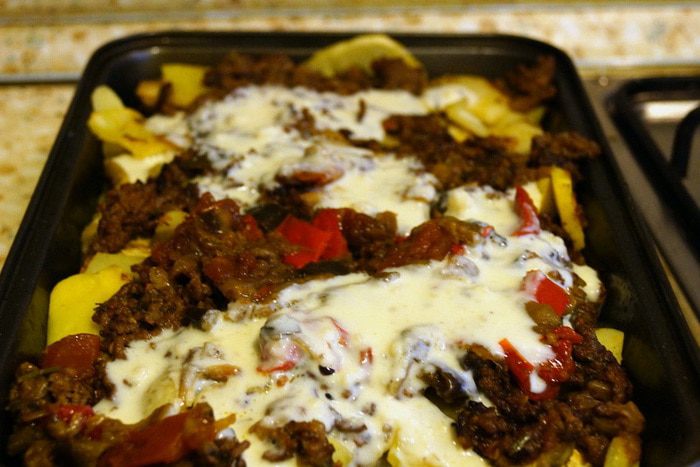 Берем форму, в которой будем запекать нашу мусаку. Советую взять форму с более высокими краями. Смазываем дно маслом, посыпаем панировочные сухари. Затем выкладываем слои: болоньезе, картофель, баклажаны, болоньезе, картофель, баклажаны, болоньезе.