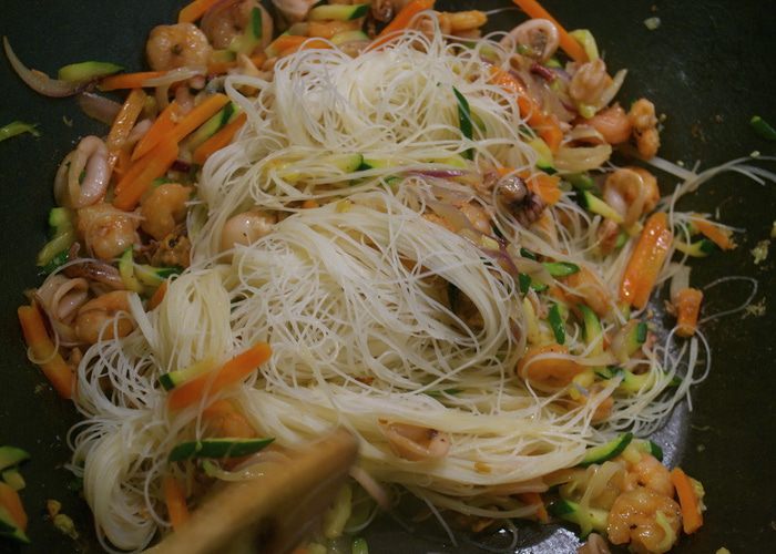 Заранее приготовить рисовые спагетти, согласно указаниям на упаковке. Как только овощи станут мягче, добавить к ним морепродукты, спагетти из риса и в конце - яйцо... Тщательно все перемешать.