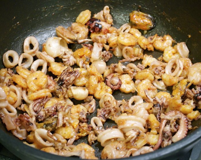 Морепродукты обжарить в небольшом количестве оливкового масла.