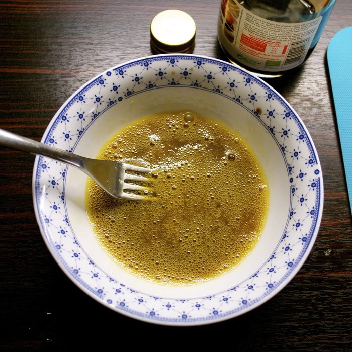 Яйцо разбить и смешать с небольшим количеством соевого соуса.
