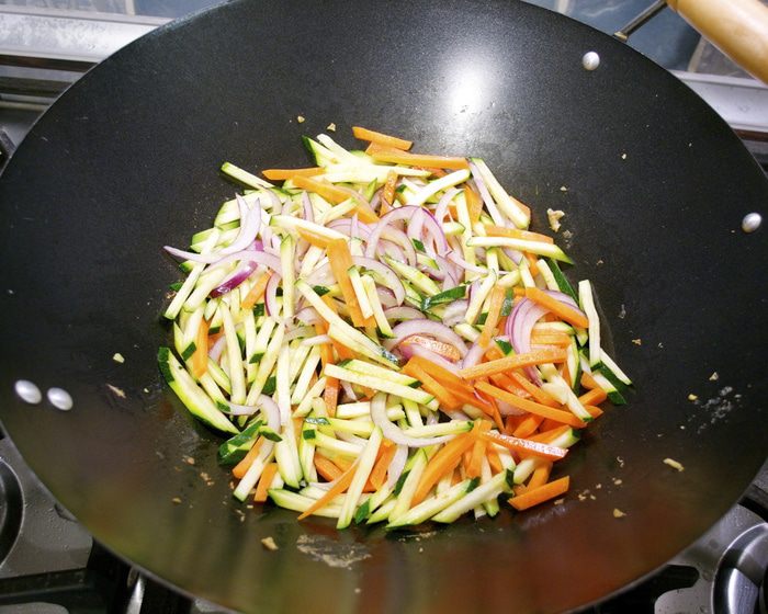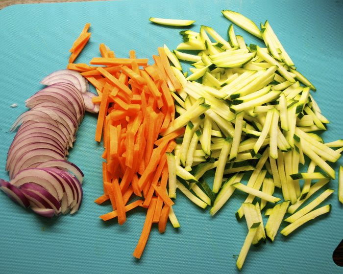 Тем временем овощи нарезать тонкой соломкой; лук тонкими полукольцами. Вместо красного лука можно использовать лук-порей.