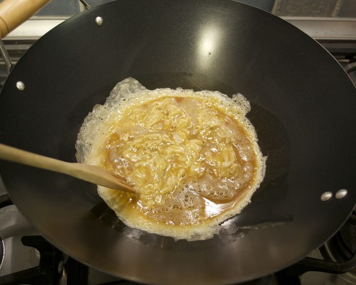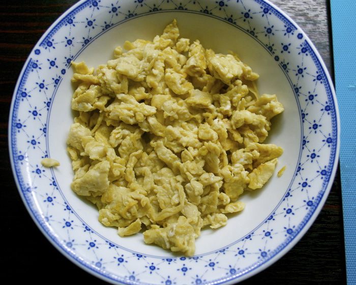 Разогреть сковороду-вок и быстро обжарить яйцо, постоянно помешивая, чтобы яйцо получилось "ошметками"...