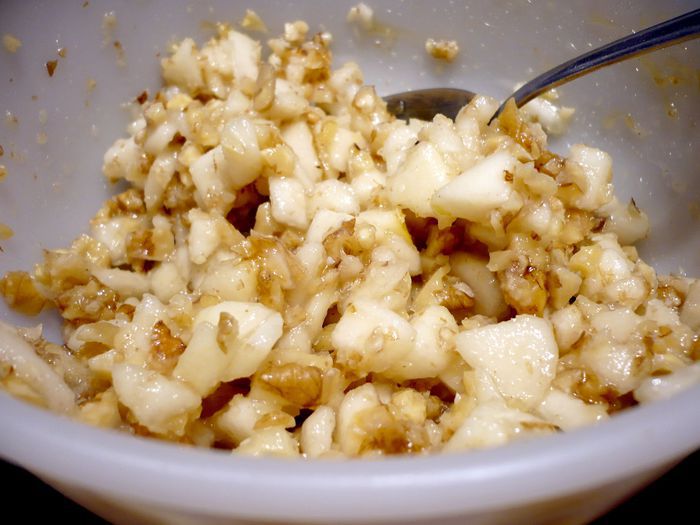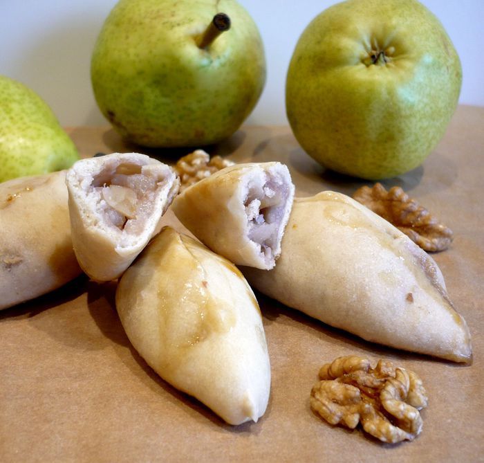 Для начинки очищаем груши от кожуры и семян, режем их на небольшие кусочки, сбрызгиваем соком лимона, смешиваем с мелко порубленными орехами, кленовым сиропом и медом. Начинка готова. Теперь разогреваем духовку до 190 градусов. Делим тесто на три части. На присыпанной мукой поверхности раскатываем каждую часть тоненько до 1-2 мм. Стаканом вырезаем круги, на них кладем начинку, хорошо скрепляем края. Ставим в духовку примерно на 20 минут.