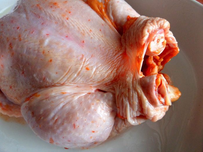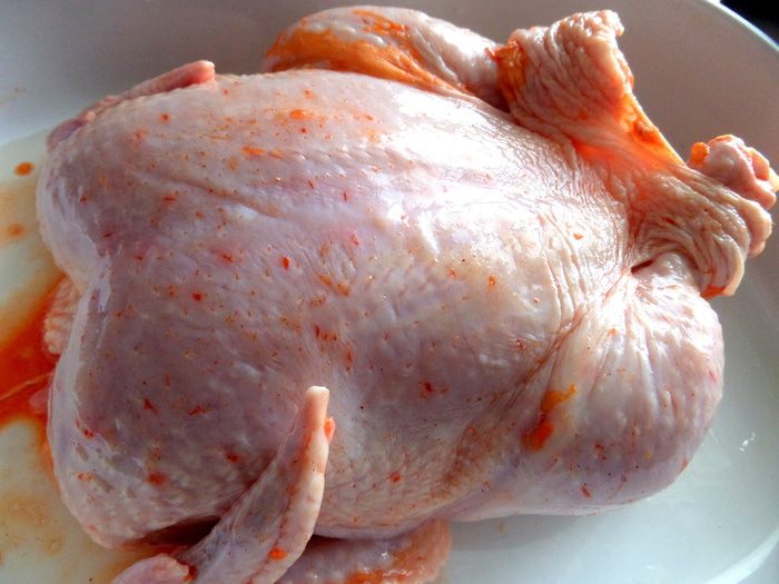 Для моей семьи нужна большая курица,эта весит ровно 2 кг! Промываем,обсушиваем и натираем специями и приправами всю,в том числе и внутри!