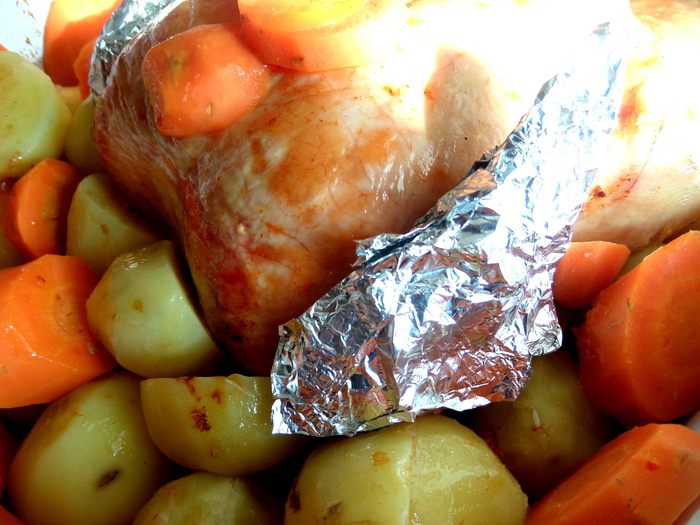 Сверху я тоже положила кружочки морковные. Все овощи поливаем собранным от курицы соком и жиром.