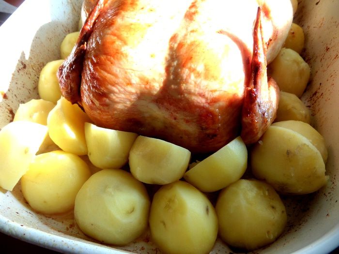 Укладываем недоваренную картошку вокруг курицы.