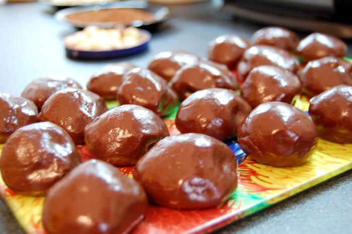 Из охлажденного теста скатываем шарики желаемого размера. По желанию, в половину трюфелей можно добавить орешек. (я добавляла фундук в те, которые в дальнейшем обваляла в какао)