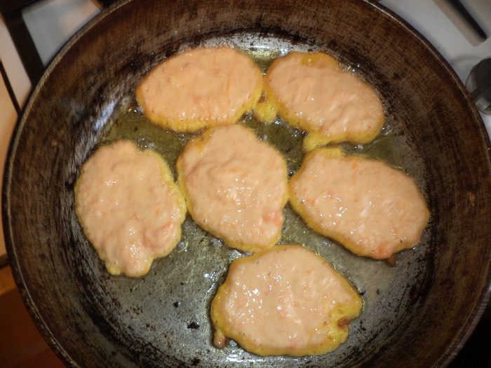 На сковороде разогреть растительное масло. Выкладывать тесто ложкой на сковороду, жарить оладушки с двух сторон до румяной корочки.