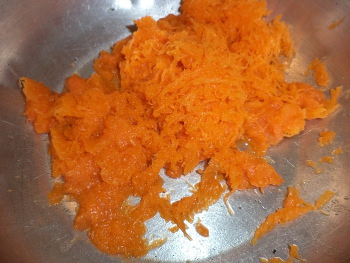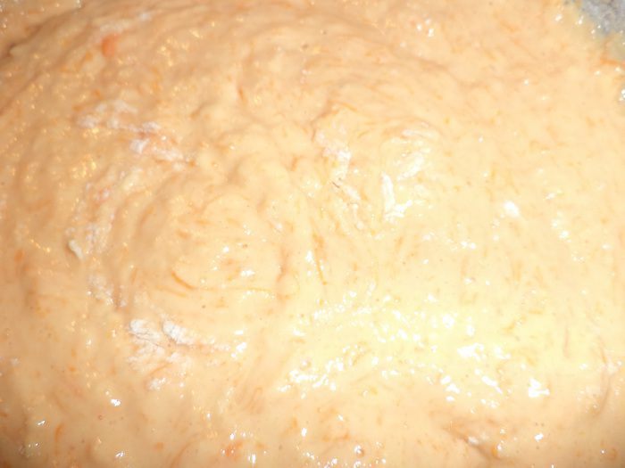 К тыкве добавить молоко, сахар, ванилин, желтки, соль, муку и соду. Перемешать. В массу осторожно вмешать взбитые белки, перемешать.