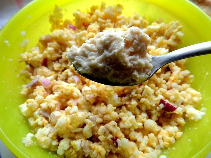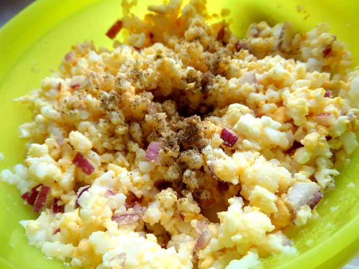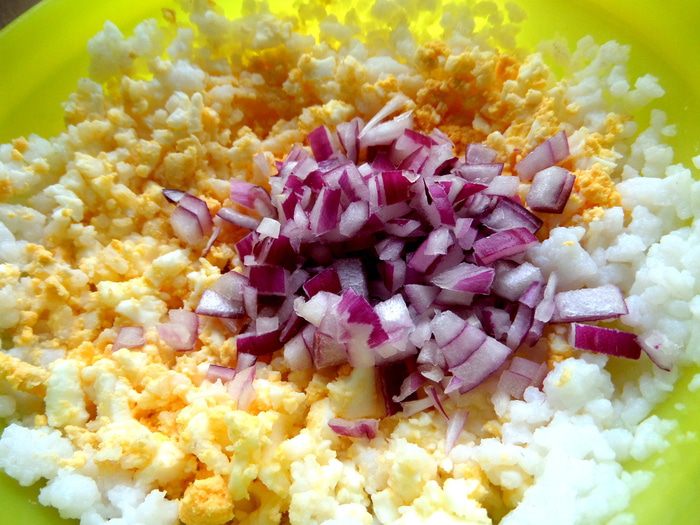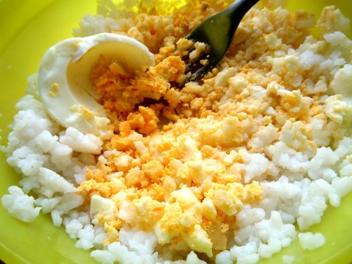 В отваренный рис добавим отварные яйца (остались от завтрака).