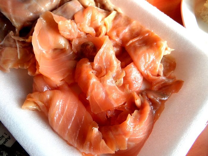 Из готовой упаковки красной рыбки выбираем тонкие длинные кусочки.