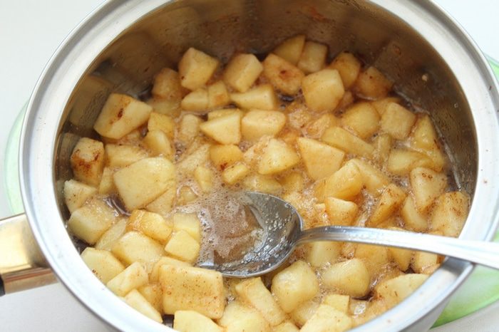 Нагревать на среднем огне, помешивая. После закипания уменьшить огонь и готовить, помешивая, 6-10 минут. Яблоки должны стать мягкими, а сироп загустеть, слегка остудить.