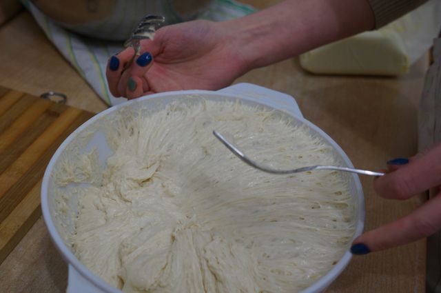 Духовку включаем на 220"С. Берем 2 вилки, обминаем тесто по краям миски, разделить на 2 части.