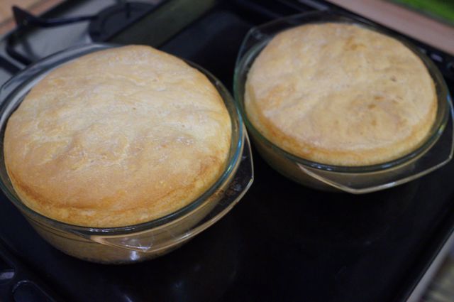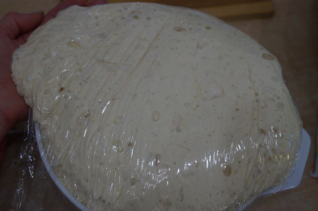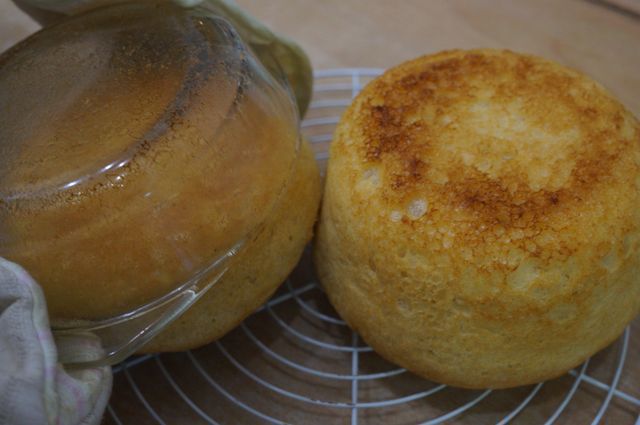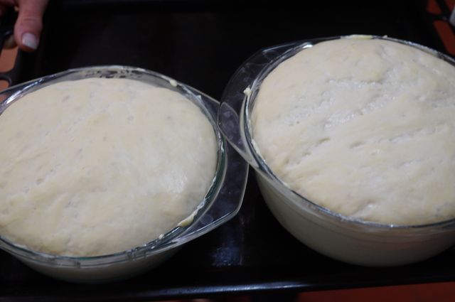 Тесто хорошо увеличилось в объеме; здесь 2 формы - 0,9 и 1,5 л, ранее я писала, что лучше взять миски объемом 1 л.