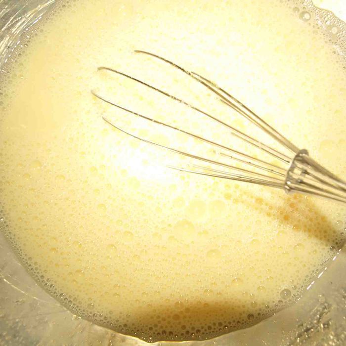 Добавляем муку, молоко и взбиваем, чтоб не было комочков.