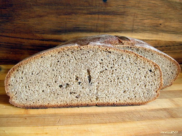 Высыпать просеянную муку в воду и замесить тесто. Добавить закваску и вымешивать тесто либо в комбайне в течение 10 минут, либо вручную в течение 15-20 минут. Чем дольше вымешиваете тесто, тем лучше развивается клейковина.