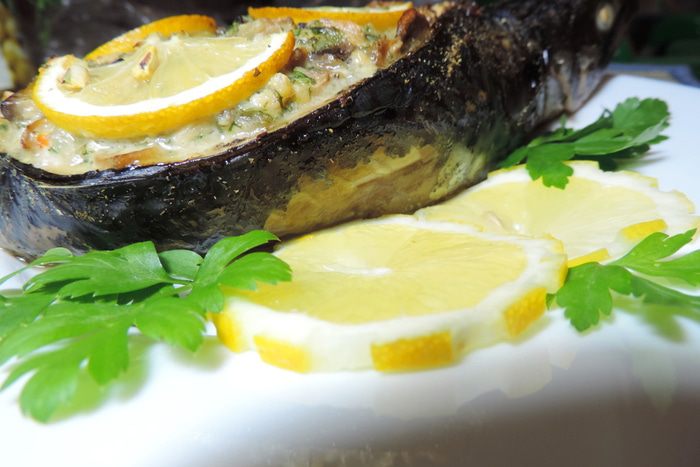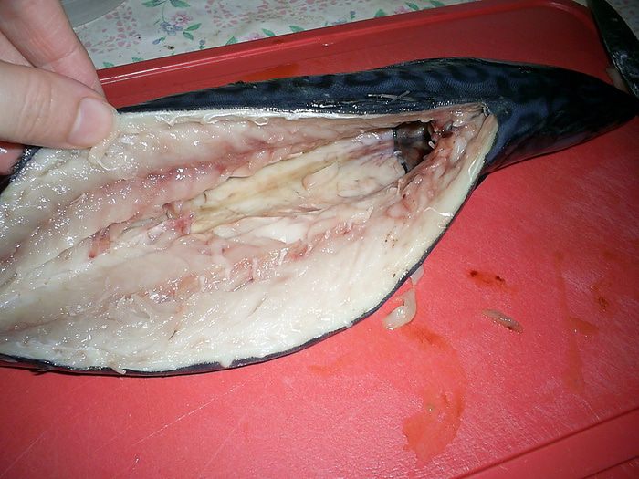Нам понадобится свежая или предварительно размороженная скумбрия. Рыбу моем, разрезаем со спины вдоль хребта. Через полученный разрез удаляем хребет и внутренности. Тщательно промываем рыбку. Голову и хвостик не обрезаем. Тушки натираем солью, приправой для рыбы и лимонным соком (примерно 1,5 ст.л.) внутри и снаружи. Отправляем в прохладное место мариноваться 20-30 минут.