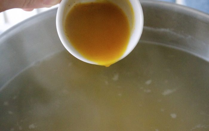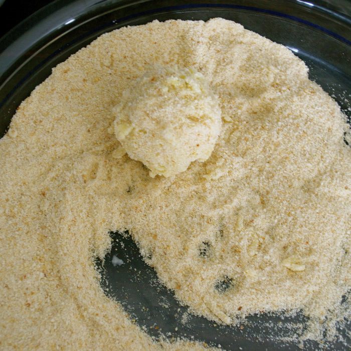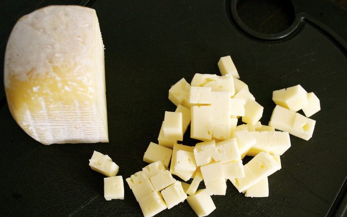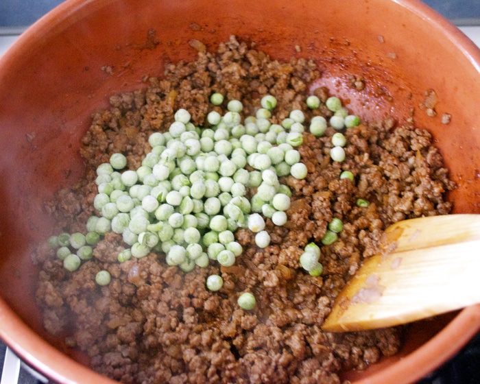 Теперь займемся приготовлением начинки для колобков. Лук мелко нарезать и положить обжариваться на сковороду с оливковым и сливочным маслом. Как только лук станет мягче, добавить фарш. Обжарить, помешивая, минут 7. Затем влить вино и дать ему испариться.