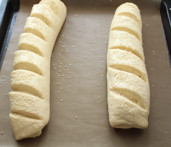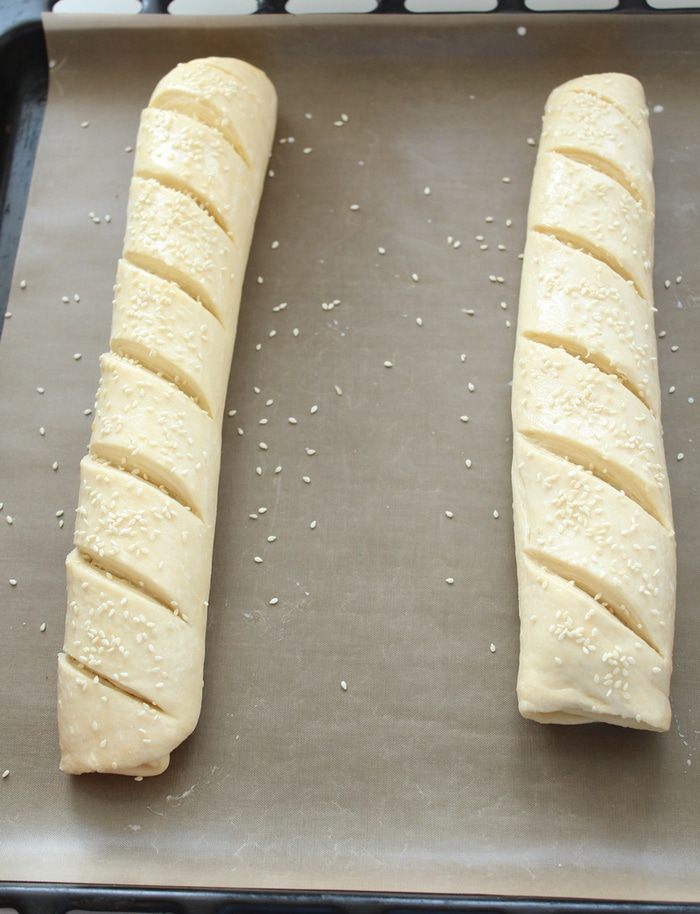 Выложить рулеты на бумагу для выпечки. Смазать взбитым яйцом или молоком. Посыпать кунжутом и сделать косые надрезы.