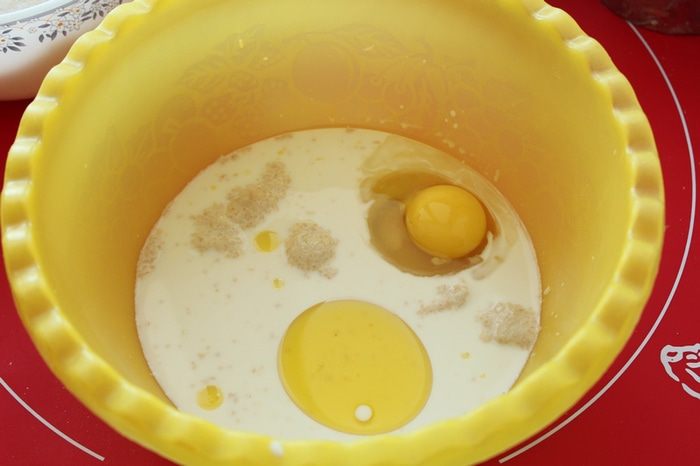 Дрожжи развести в смеси теплой воды и молока. Добавить сахар, яйцо, растительное масло.