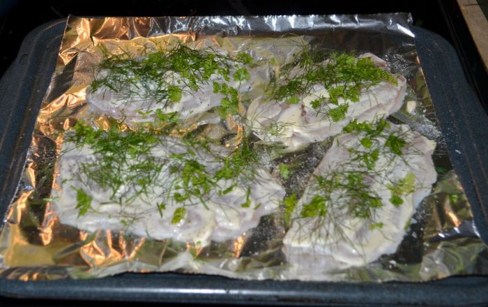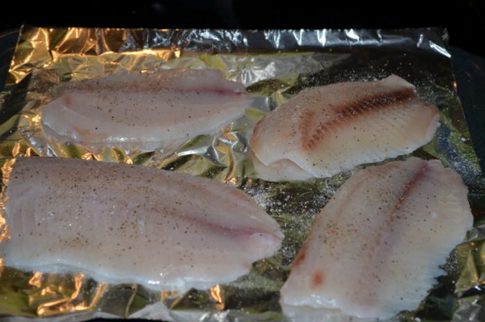 Разогреем духовку до 190 гр. Выложим на противень фольгу, тилапию посолим, поперчим и выложим на фольгу.