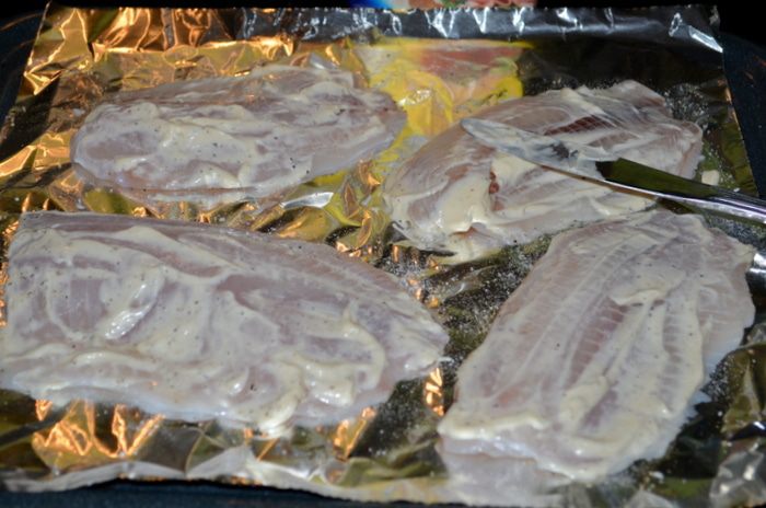 Майонез распределим на 4 филе, размажем ножом.