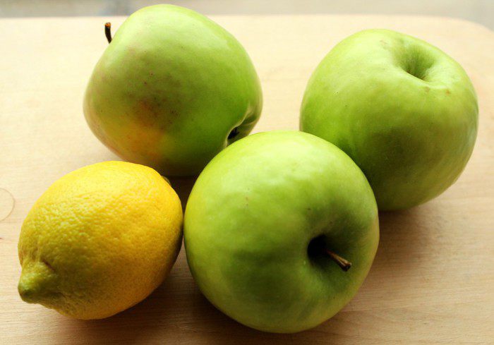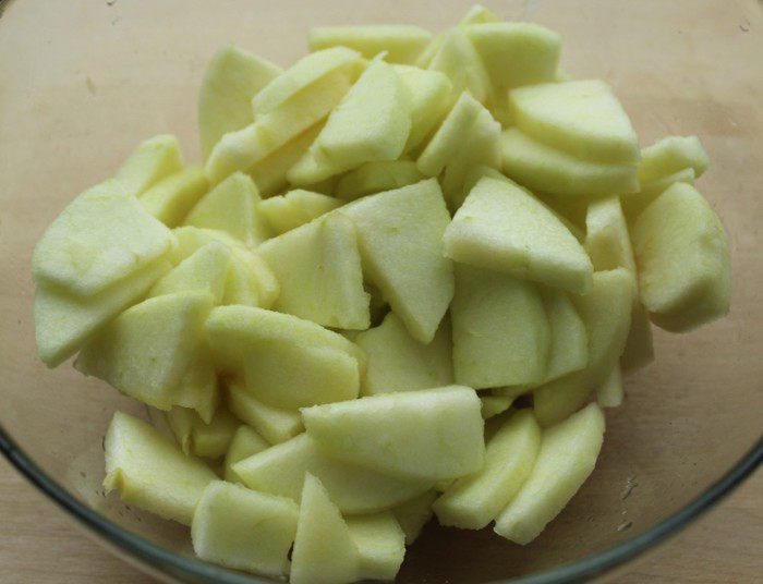 Очистить яблоки от кожицы, удалить семена и нарезать пластинками. Положить в глубокую чашку и залить соком лимона.