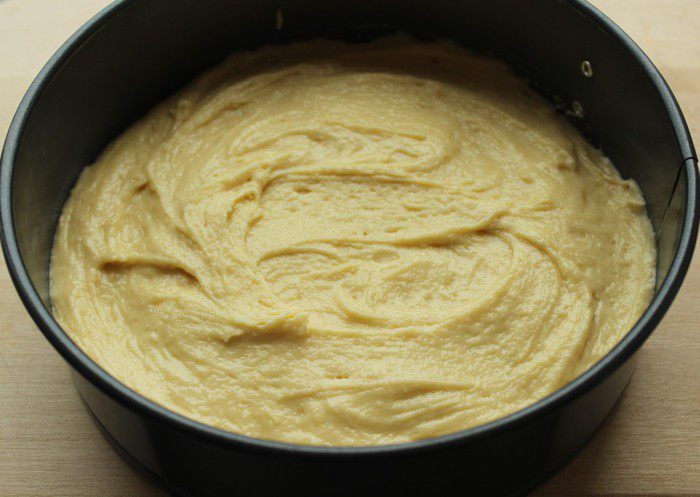 Форму 22 см выстелить бумагой для выпечки. Я выстилаю только дно, а стенки обмазываю сливочным маслом. Выложить в форму 1/2 теста.