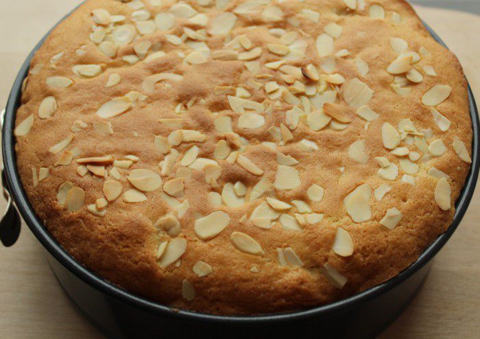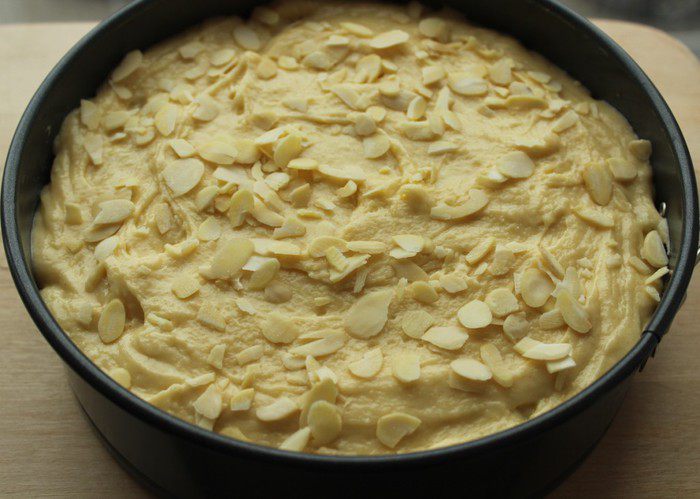 Посыпать миндальными лепестками и отправить в разогретую до 180 градусов духовку.