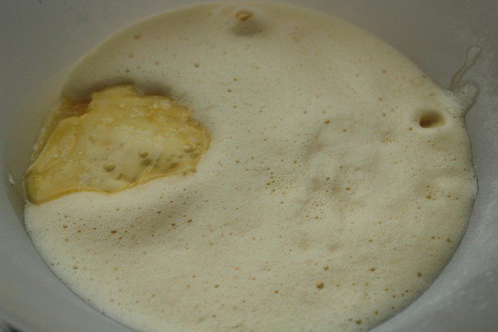 Яйца слегка взбить, сливочное масло растопить. Добавить к сухим ингредиентам.
