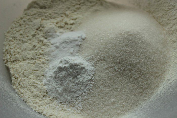 Смешать для теста муку, сахар, разрыхлитель и соду...