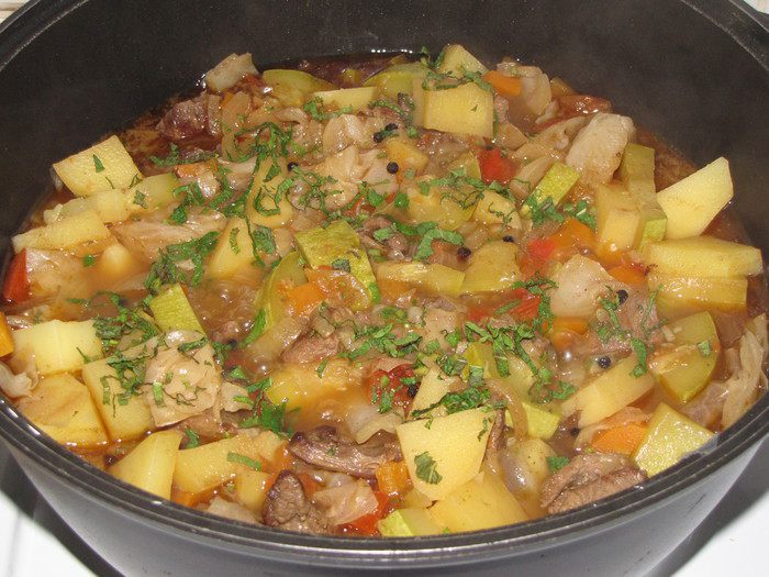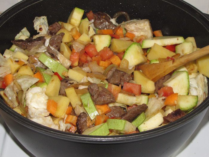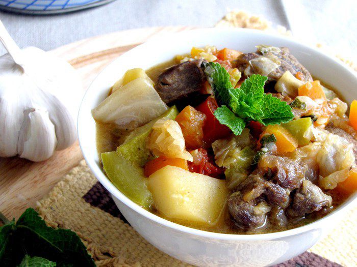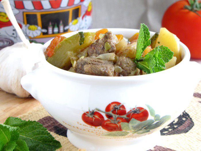 Очень вкусный микс из овощей и нежнейших кусочков мяса с ароматом мяты! Мне кажется, мята из всех трав наиболее сочетается с бараниной. Попробуйте и вы это вкусное блюдо.