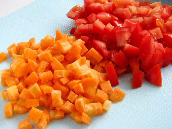 Морковь и помидоры нарезать кубиками. По рецепту предлагается взять крупные помидоры и морковь.