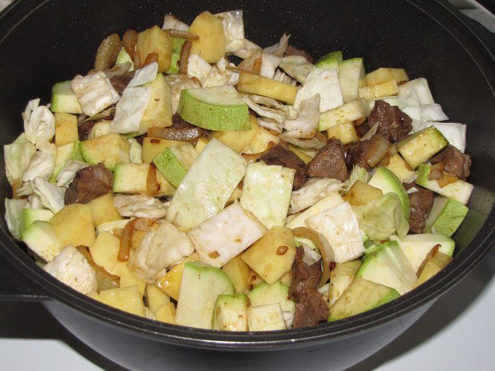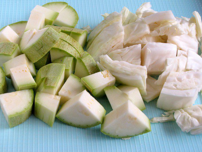 Кабачки, если не большие, возьмите 2 штуки. Если крупные, то достаточно одного. Нарезать половинками или четвертинками кружков. Капусту нарезать крупными квадратиками.