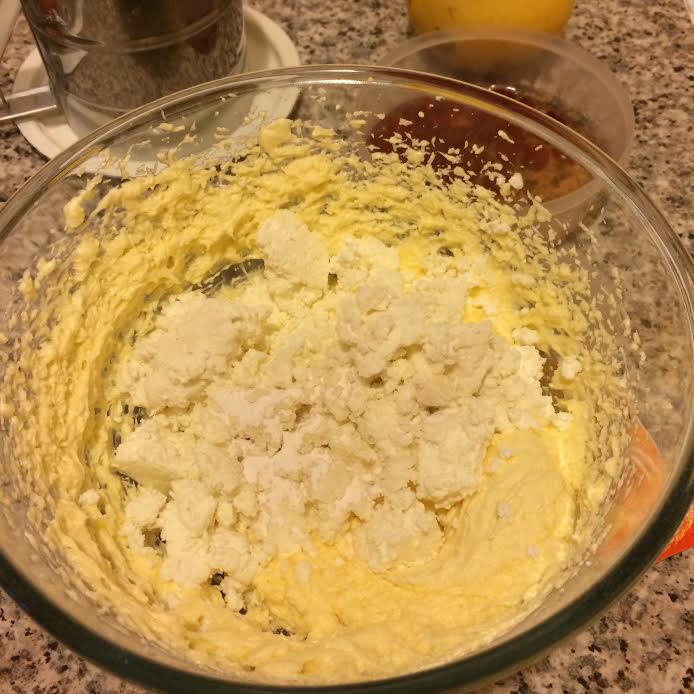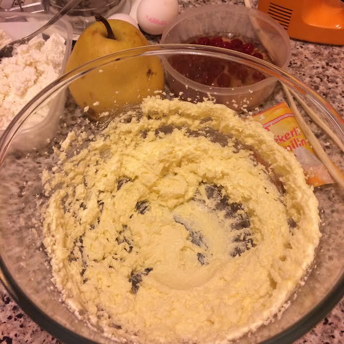 Затем добавить творог, ванильный сахар и еще раз взбить.