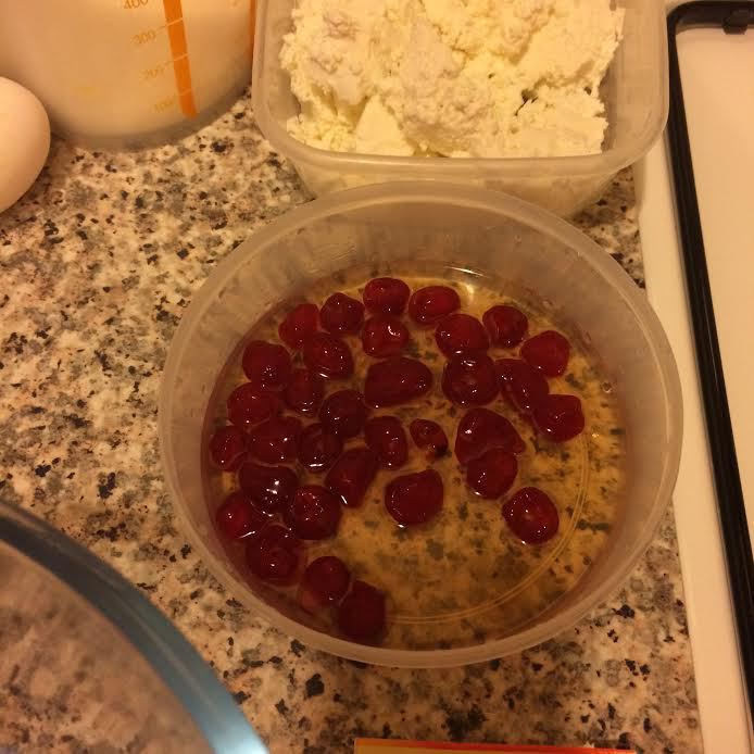 Вишню замочить в коньяке на 15 минут. Духовку нагреть до 190°С.