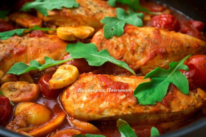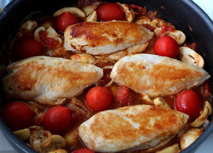 Вернуть на сковороду куриное филе, выложить черри, довести соус до кипения. Тушить 15 минут на слабом огне до готовности филе и до загустения соуса. Филе один раз перевернуть.