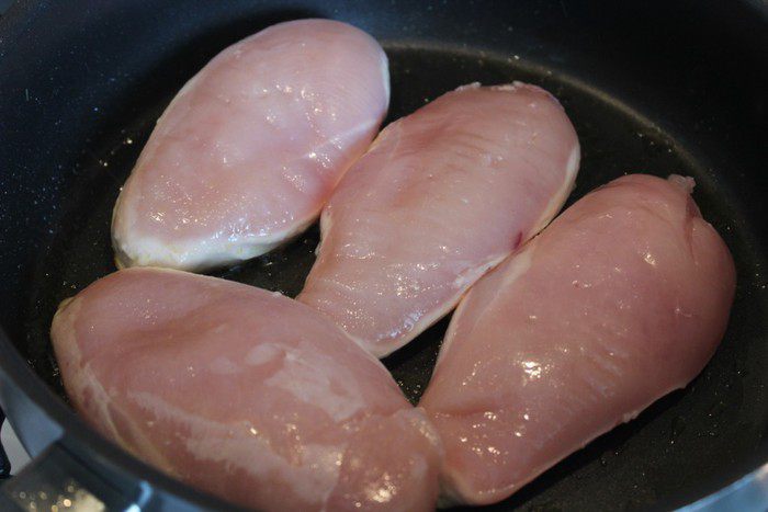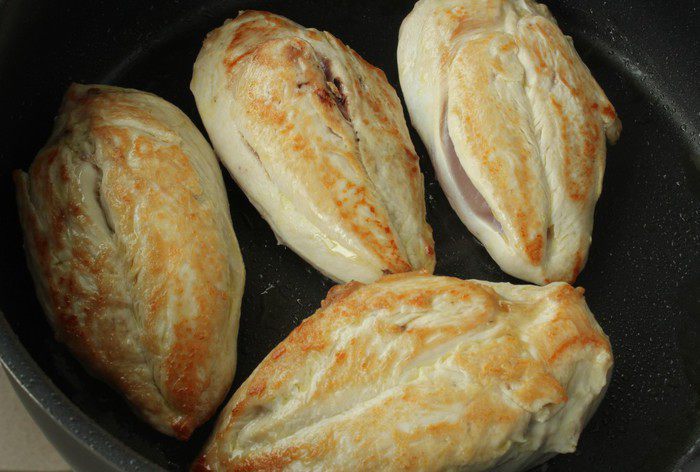1 ст.л. масла разогреть на сковороде. Куриные грудки без кожи и костей обжарить на сильном огне по 3 минуты с каждой стороны.