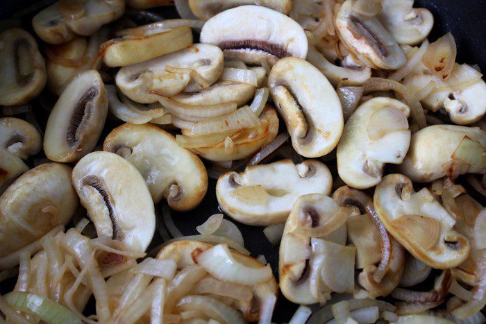 Лук и грибы нашинковать. Добавить в сковороду оставшееся масло и обжарить грибы с луком на среднем огне примерно 7-8 минут.