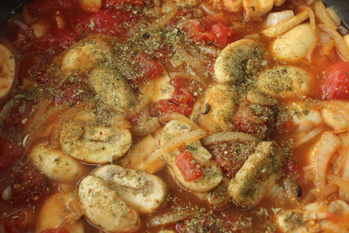 Приправить солью, перцем и молотым орегано. Влить 150 мл воды (или куриного бульона).