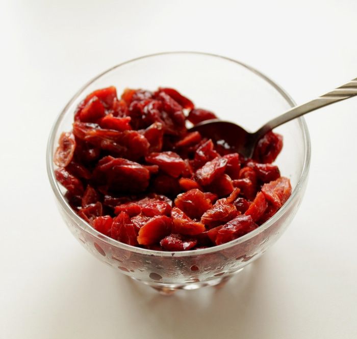 Клюкву заливаем коньяком и отставляем примерно на час. Несколько раз перемешиваем в процессе настаивания.