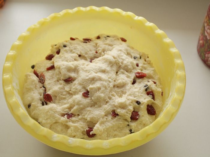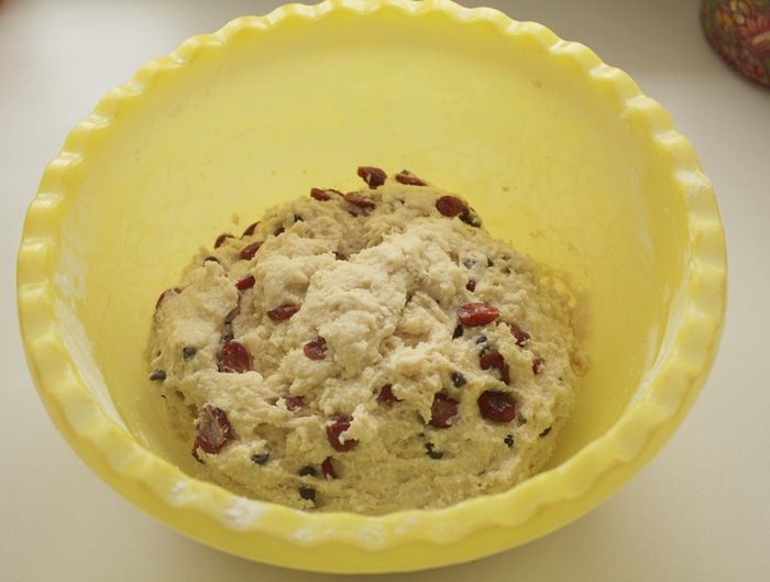 Добавляем клюкву, обваленную в муке. Постепенно добавляем остальную муку и замешиваем очень густое липкое тесто.