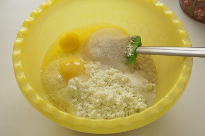 Протираем творог, добавляем опару, яйца, сахар, растопленное масло, ваниль и соль. Взбиваем венчиком до однородности.