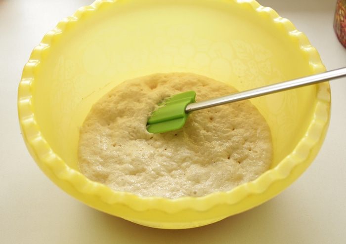 Готовим опару: Растворяем в теплом молоке дрожжи и 1 ч.л. сахара, добавляем 30 г муки и перемешиваем до однородности. Накрываем и ставим в теплое место примерно на 30-40 минут, пока опара не увеличится в объеме почти вдвое.