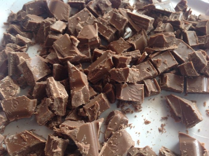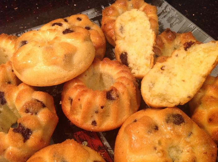 Шоколад раскрошить, добавить в тесто. Тесто вылить в формочки. Поставить в духовку разогретую до 180 градусов. Выпекать 50-60 минут, готовность проверить зубочисткой.